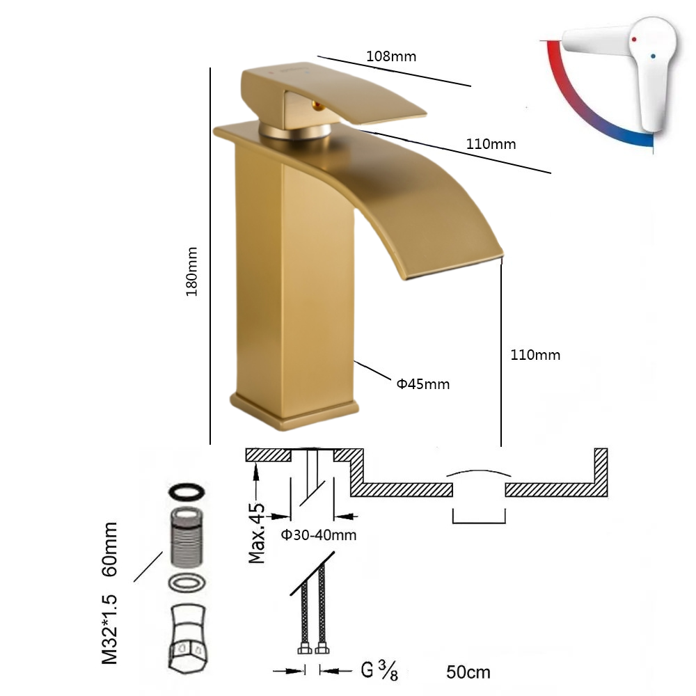 Apportez une touche contemporaine à votre salle de bains avec un mitigeur cascade en or brossé qui allie design compact et fonctionnalité premium.